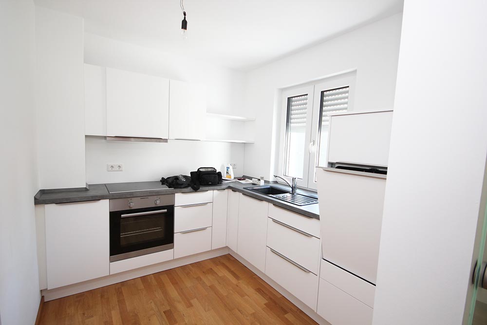 Die Küche liegt separat daneben und ist über eine satinierte Glasschiebetüre zu erreichen. Eine moderne Einbauküche inklusive sämtlicher Elektrogeräte ist im Mietpreis enthalten.