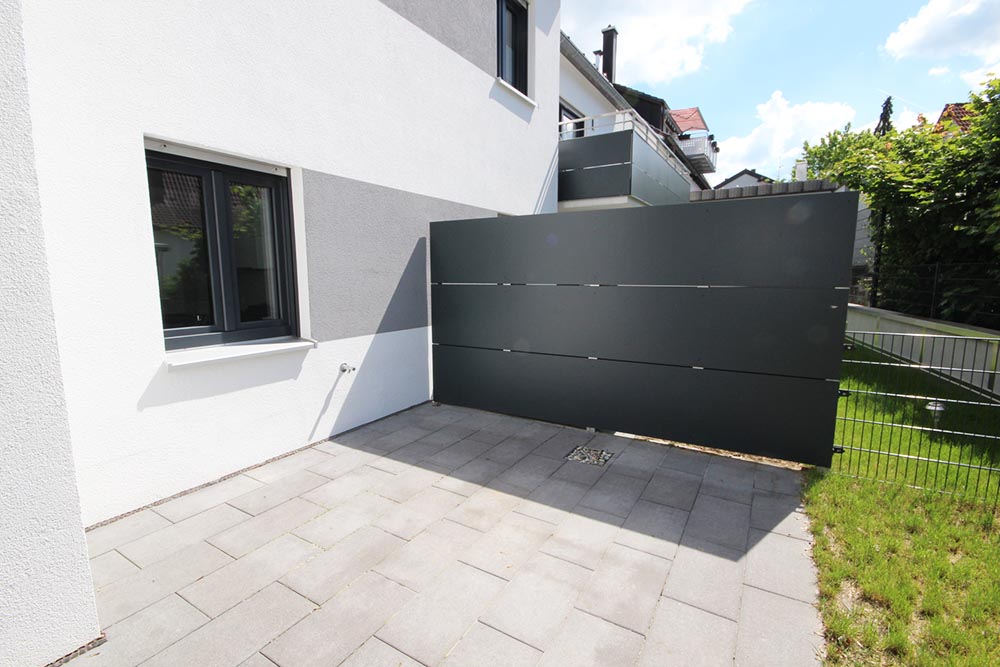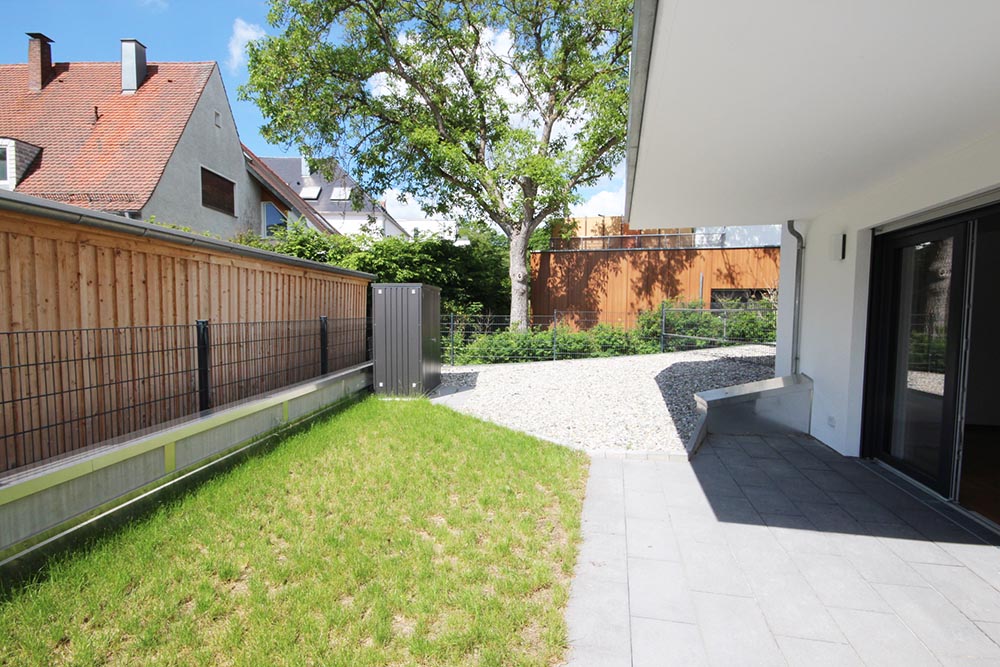 Wohnen und Essen sind offen geschnitten; verbunden mit Zugang zur geschützten Terrasse mit überschaubaren Grünstreifen.