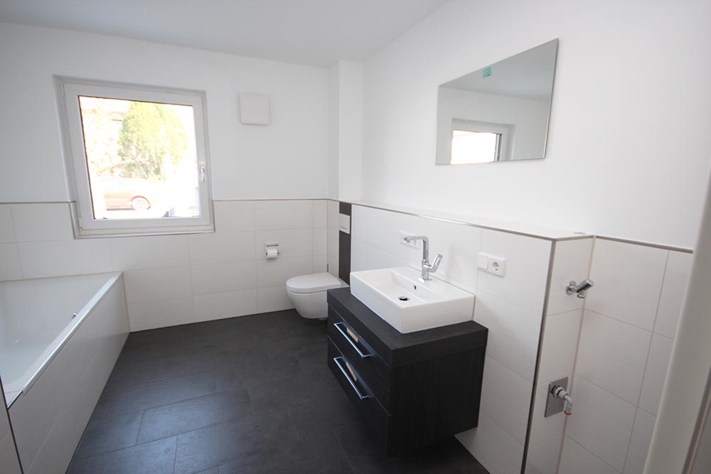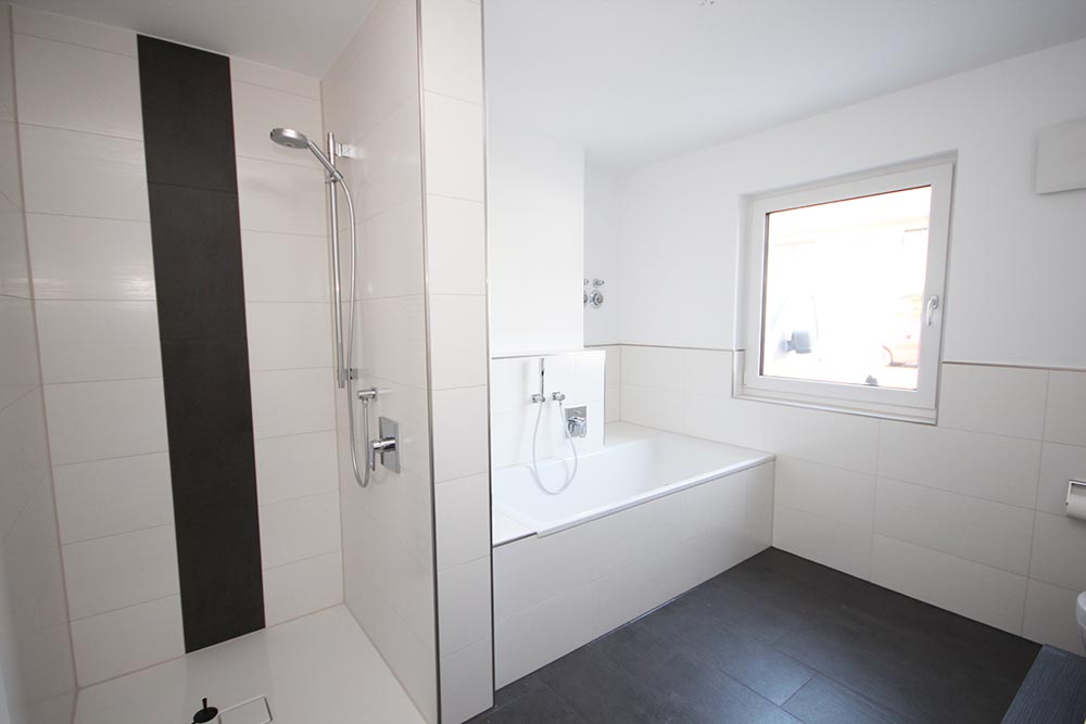 Highlight der Wohnung ist das moderne Bad. Wellness pur bieten die großzügige Wanne und die übergroße Dusche, verbunden mit einem modernen Waschtisch inklusive Möblierung, Waschmaschinenanschluss und WC.
