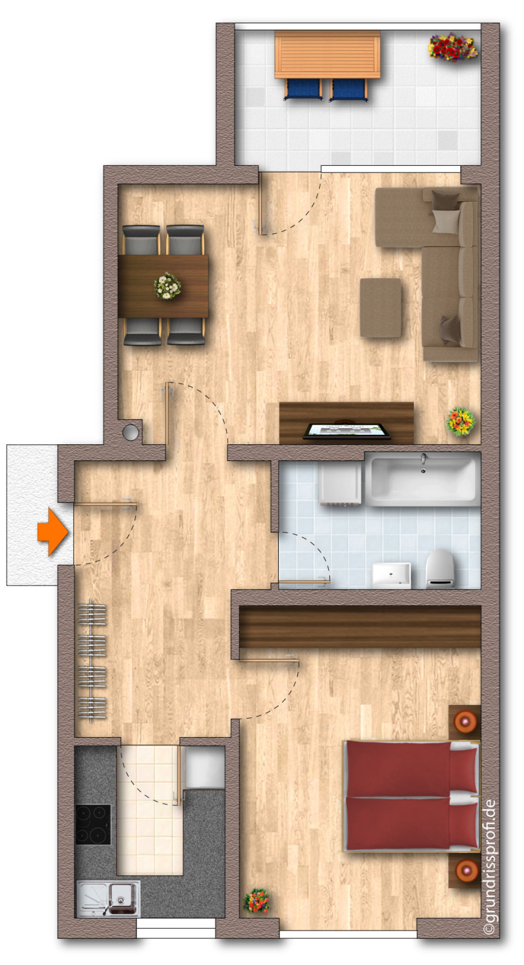 Der Grundriss ist wunderbar geschnitten. Wohn- und Esszimmer bieten individuellen Freiraum zum Erholen und Genießen. Die angrenzende Loggia ist ruhig nach Westen gelegen.