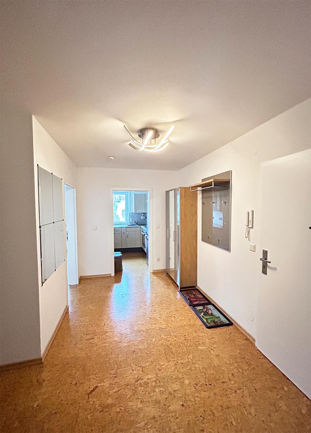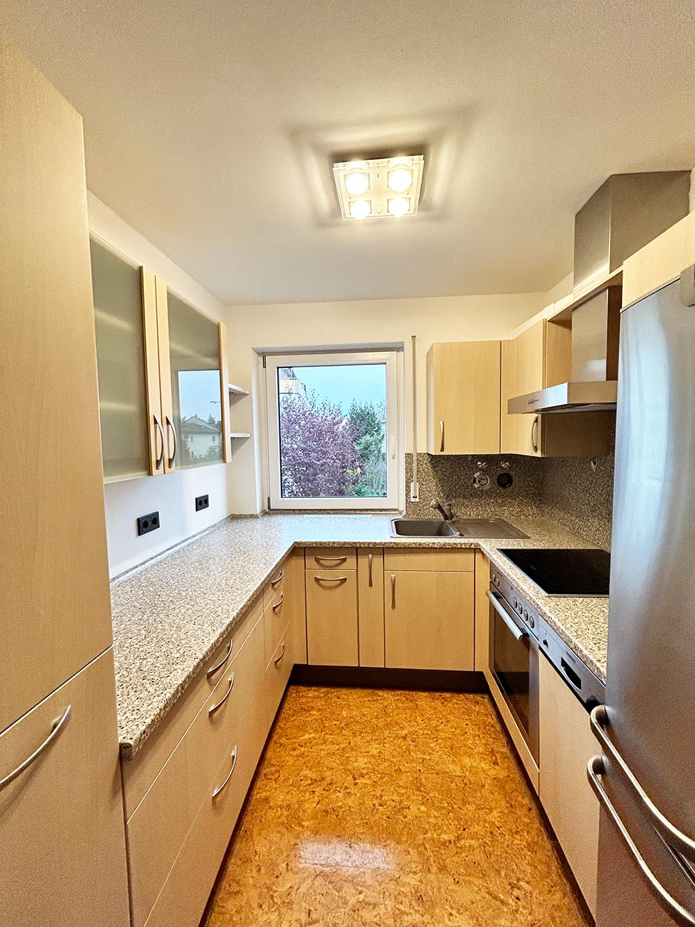 • Korkböden in Flur, Küche, Schlafen; Parkettlaminat in Wohnen / Essen; Fliesenböden im Bad